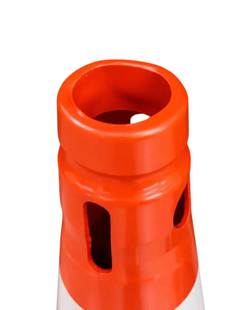 Para garantir melhor desempenho em condições adversas, como chuva e pisos molhados, o cone é equipado com 8 sapatas elevadas em sua base, que aumentam a aderência ao solo e reduzem o risco de escorregamento ou instabilidade.